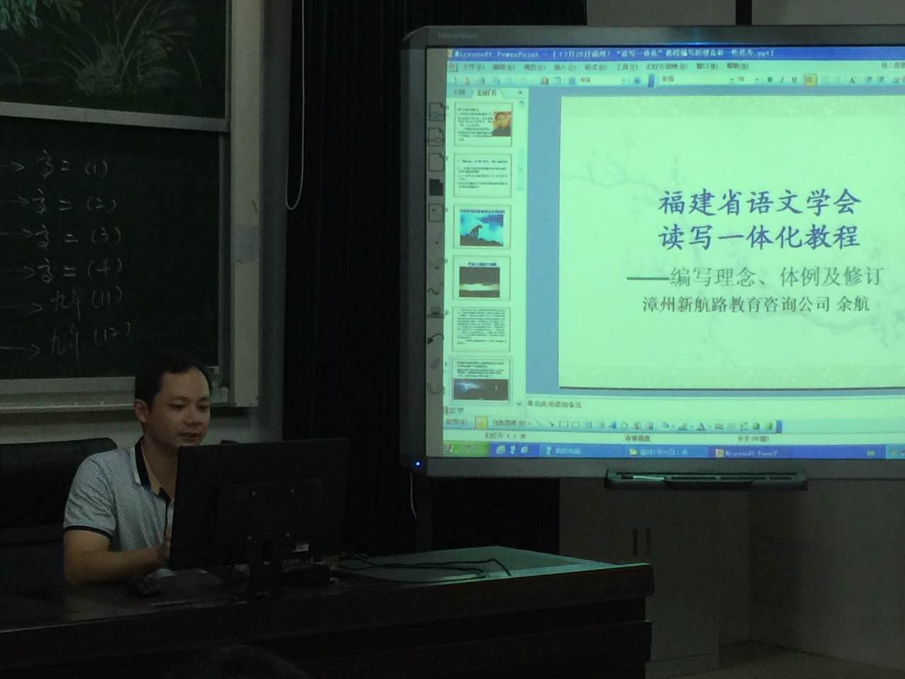 会议的第二项议程,由余航老师就“福建省语文学会读写一体化教程”的主题展开演讲。余航老师通过自己对教材的理解和研究,将自己编写教材的心得体会与在场的老师们进行分享、交流。他具体分析了《新读写例话》教材的基本纲要、编写体例,以及研究生一稿编写存在的不足,为教材的进一步编审提供了指导性的意见。