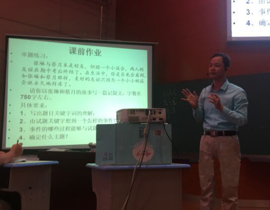 漳州高中质检考试命题组核心成员余航老师,以初二年级“运用作文提纲监控记叙文的详写文段”为教学内容,启发学生锻炼写作思维。课堂上,他引导学生按写作轴线提纲写作记叙文,抓住关键点和切题词,对重要细节展开叙述,并引导学生有策略地修改升格提纲。余航老师说,这几年,他一直在探索作文教学的新方法,希望能立足于学生写作的过程,而不是仅仅是灌输知识。从长远的角度来讲,锻炼一种深刻、有效、精准的思维过程,更有益于学生的成长。传授思维工具和思考方式,可以让学生精准发力,对考试的要求认识更深,不仅知道怎么做,而且知道怎么做更好。